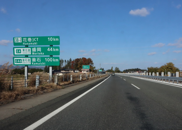 「38-2」花巻JCT 10km 「[E4]東北道」盛岡 44km 「[E46]釜石道」釜石 100km