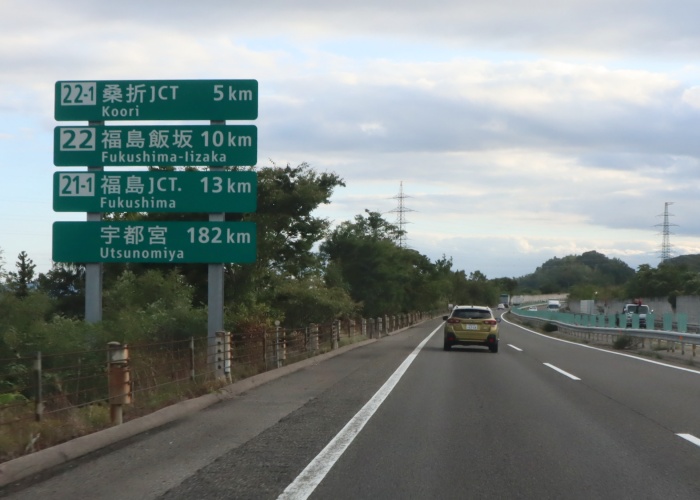 「22-1」桑折JCT 5km 「22」福島飯坂 10km 「21-1」福島JCT 13km 宇都宮 182km
