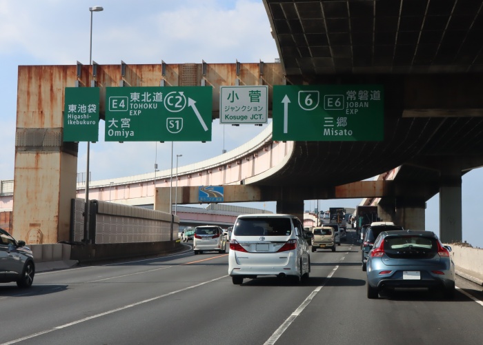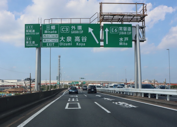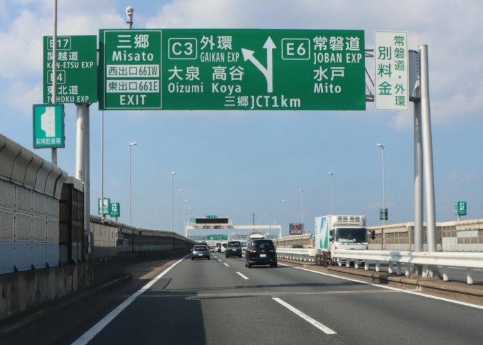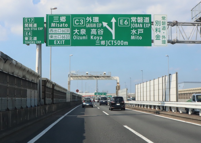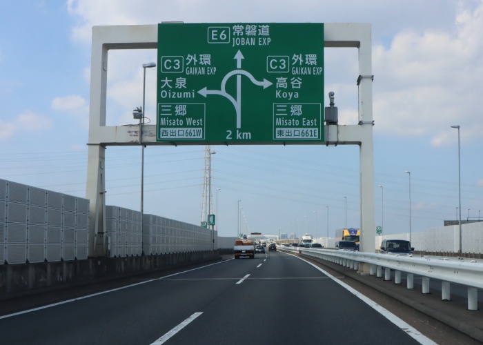[E17]関越道 [E4]東北道 「三郷「西出口661W」「東出口661E」」 [C3]外環 大泉 高谷↖ ↑[E6]常磐道 水戸